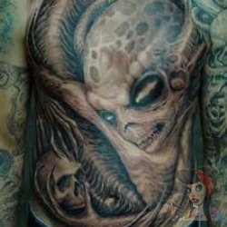 Alien holding a skull covering his entire stomach and chest!So sick I wish I knew who did this work!